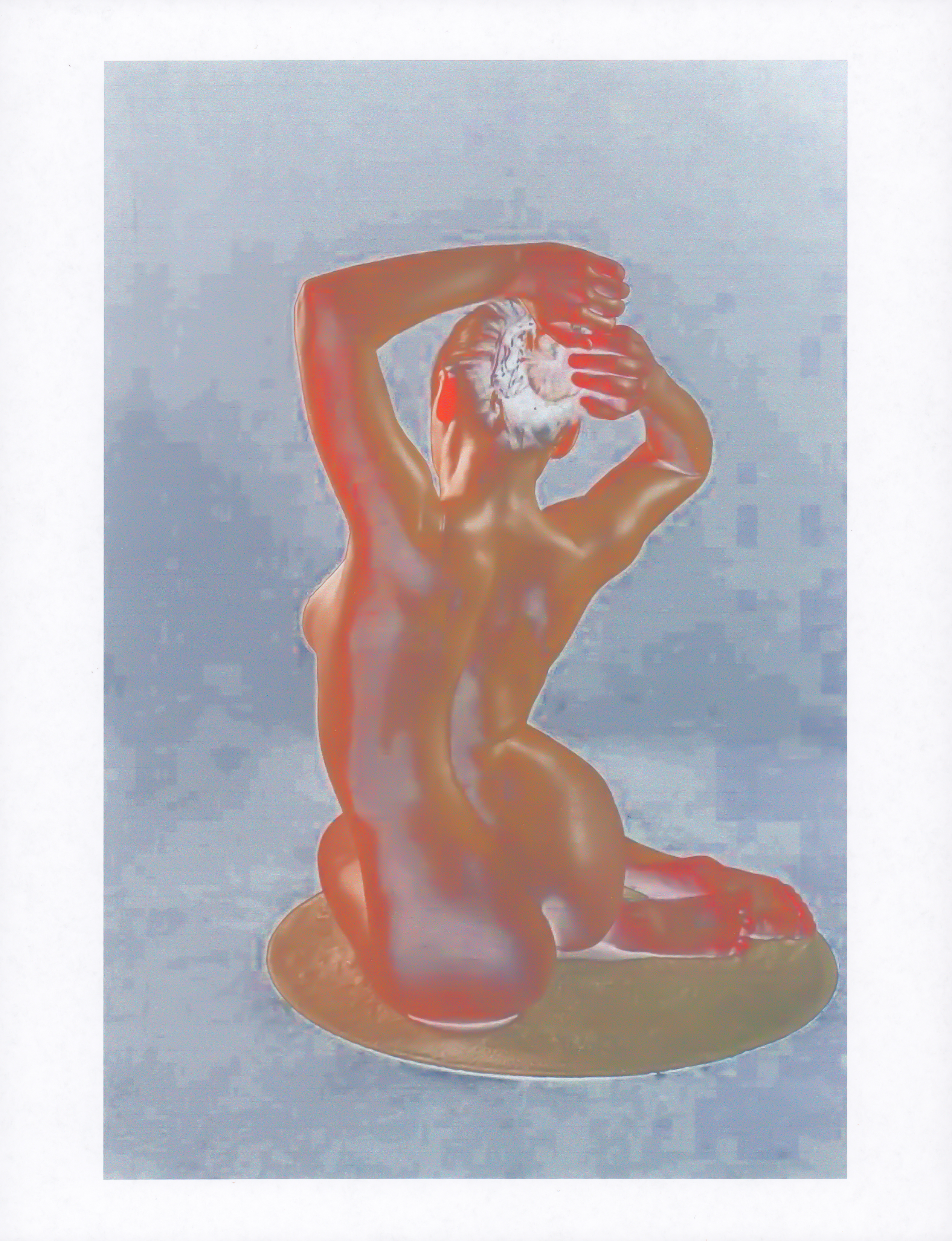 Low inket levels in my HP printer created unique prints with tonal glitches. Printing the digital pictures were for physical copies to use in drawing and tracing as a reference. The image colors became solarized, and contained broken lines with artifacted digital textures exentuated. After scanning the prints I modified their photographic values with in Adobe Lightroom. I created different versions of colorization and tonal scale to maintain a sense of unique generation of the original images despite the transferal back to a digital origin.