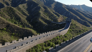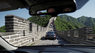 Beginning a side car view of the Great Wall of China from a moving car, the imagery looks 3D generated as if from Google Earth. The freeway has the same masonry as the Great wall that runs parallel. A car alongside the wall is improbable from an elevated road. Driving on the wall itself is more likely.