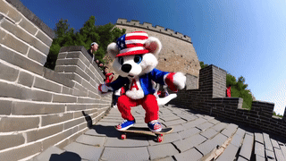 Prompt: Show a furry Rat Mascot wearing USA color outfit. Head-on POV of the Mascot riding a skateboard, along the Great Wall of China while doing skateboarding tricks. As the Mascot Chinese tourists take photos and videos with smartphones, photo cameras, and handy camcorders. Display as a single continous shot.