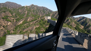 Prompt: POV from a moving car window of the Great Wall of China.
