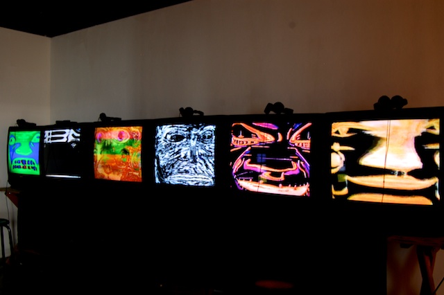 Originally I had considered Video Being to be a statement about the god-like worship. That the electronic mediums are the central focus for information and that the messages of old religous Gods are as jumbled or lost as the indicpherable anger of the screened deities. Instead I now see this work as an example as to how materials instruct human bodies to give birth their own higher forms. I did not create this artwork as much as it used me as an instrument. In this way these screens are divine and mystical because they commanded my craft. And at the end of each clip is the source video recording without audiovisual processing which peels away the amplified state of deity with its processed effects but also reveals evidence my own presence with the painting. The painting and myself are set before the camera communcating to the taping and with one another throught the camera monitor.