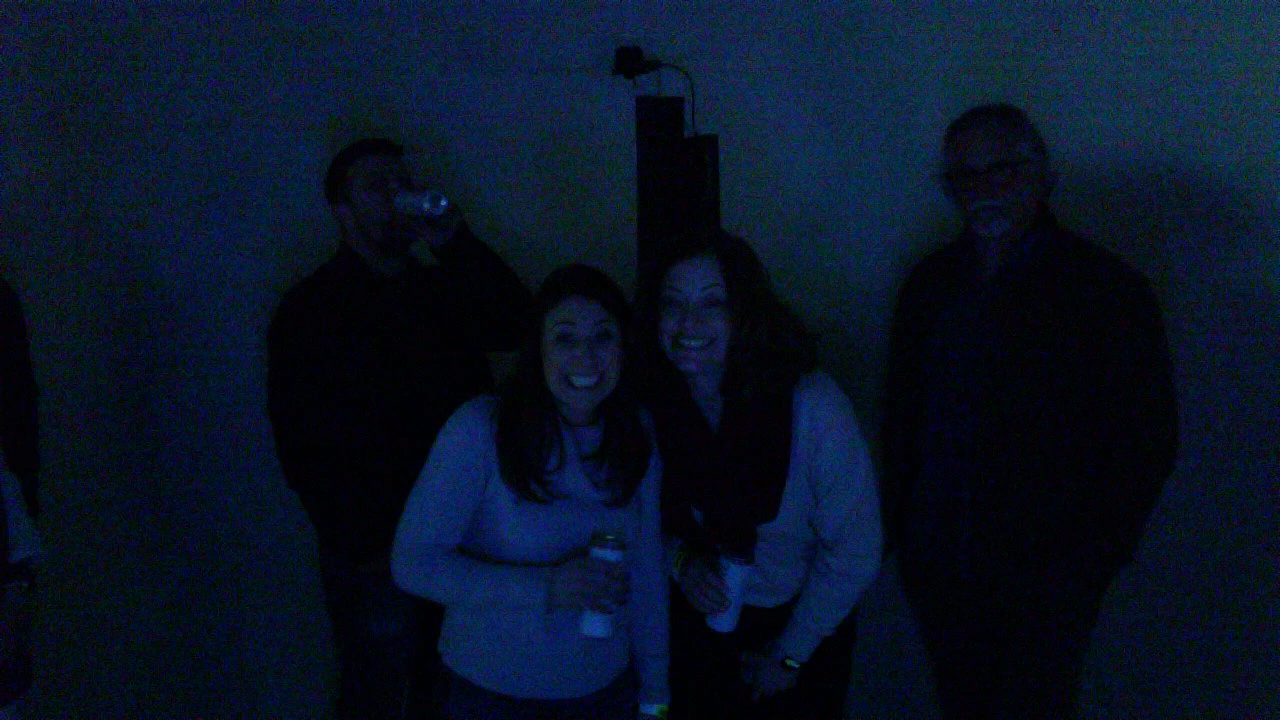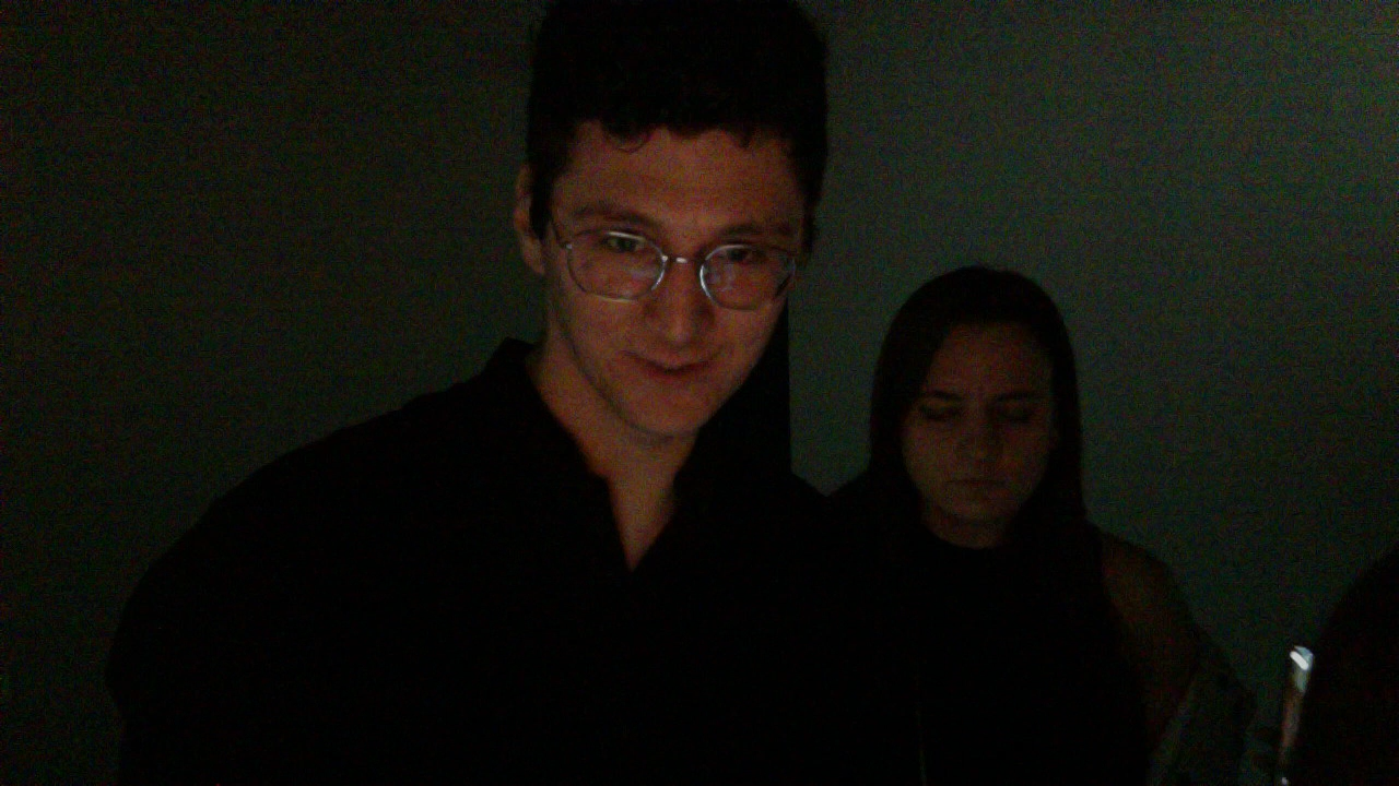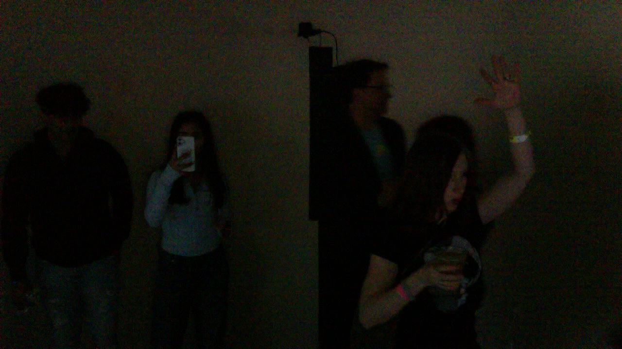 On the other side of the room, audience members addressed the GoPro camera. They’d make their appearance more prominent in the space by getting close up to the lens to show their face and hands. Then a friend would take a picture on a CRT.