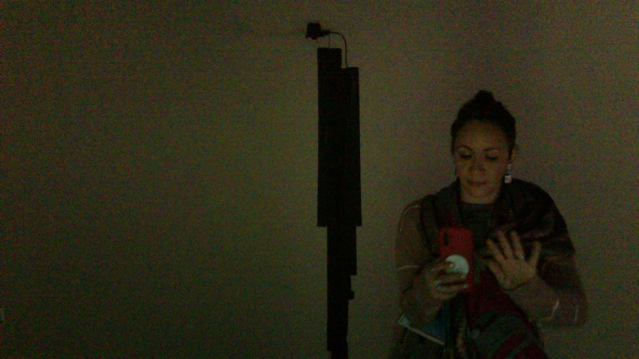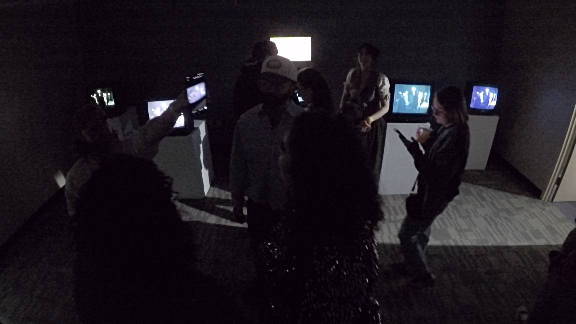 I explicity did not want to force visitors to stay in the room with the video installation. Audience goers were meant to stay for as long or little as they wanted. But by passing through the room everyone is surveilled and seen in the installation. They could experience the screens while moving quickly, slowly, or stopping at any point. I was curious to know how incoming foot traffic would be affected by the presence of real-time transmission of the video space.