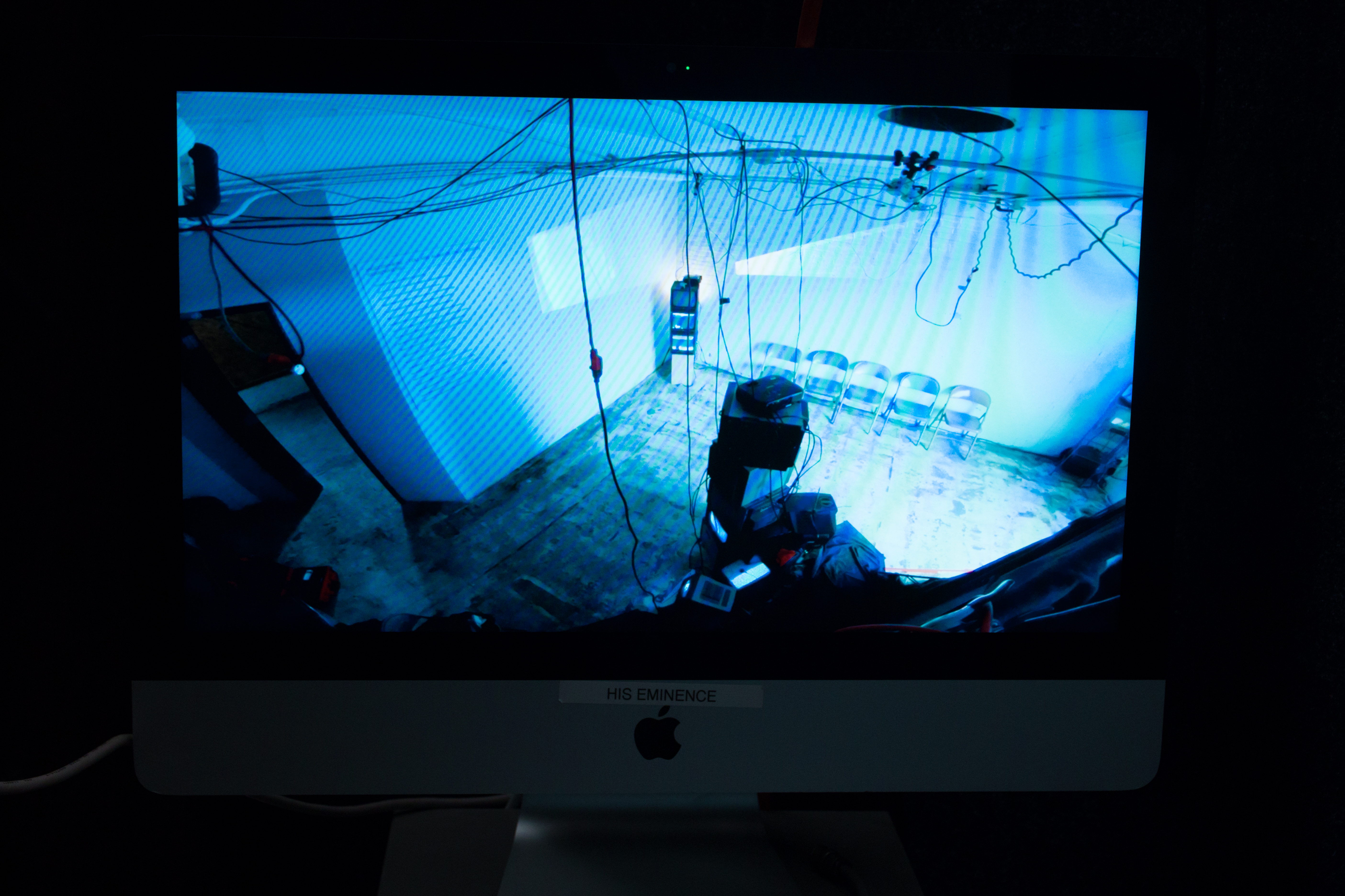 Hidden behind the white sheet used for and black plastic strips, the White Partition room hosted the VR (Virtual Reality) version of a Videosphere. This virtual experience was viewable on an HTC Vive headset and a large flatscreen monitor whose media source was a Windows PC running a UNITY build. The virtual experience is yet another surveillance space that recieves camera feeds not seen on physical monitors. 3D objects were programmed to become surfaces for webcams located in the exhibition. My reason for including VR is because it is video based.