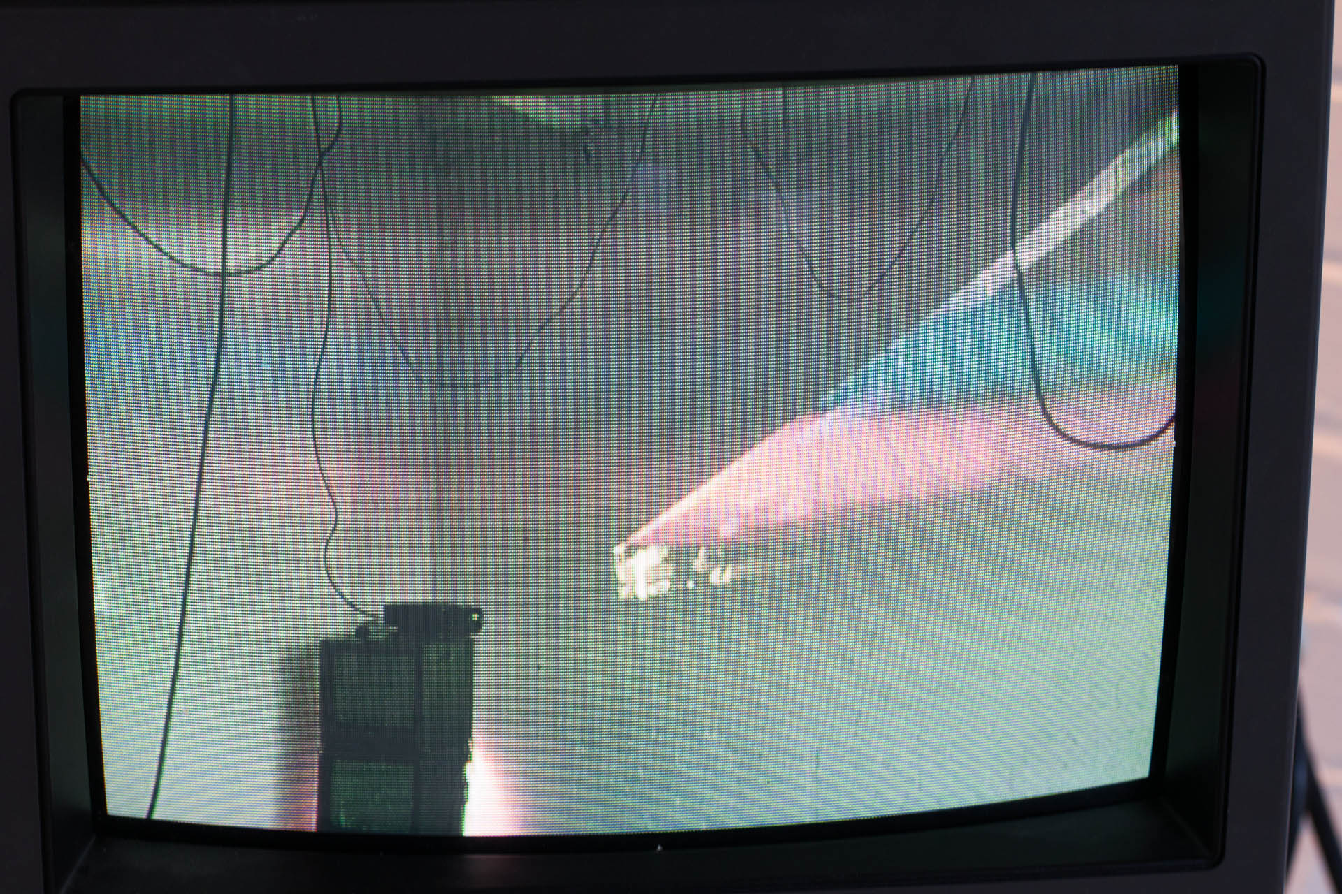 When a viewer first entered VIDEOSPHERE, they see stacks of analog video monitors. These studio monitors represent a disassembled security video system. Instead of centralized observation, the studio monitors are turned in differenct directions while security cameras watch the monitors. These old technologies provoke a sense of surprise and bewilderment upon seeing so many screens that are now obsolete but were once the dominant way of seeing information. But video image as a box is an “other” object that attracts viewers to see what exactly is on screen. What they got was the room it self on multiple closed-circuit feeds. Within monitor screens is the presence of the monitors. And when the audience aproaches the monitors, the vieweres themselves appear on one screen, then turn and see themselves elsewhere. A game begins where invidivuals try to figure out which cameras are connected to which monitors and what monitors are displayed. Knowing the locations of overt or open surveillance can be resolved by using one’s own body to activate screens. Interactions with self-image and the screen serve to help the viewer understand dislocated space.