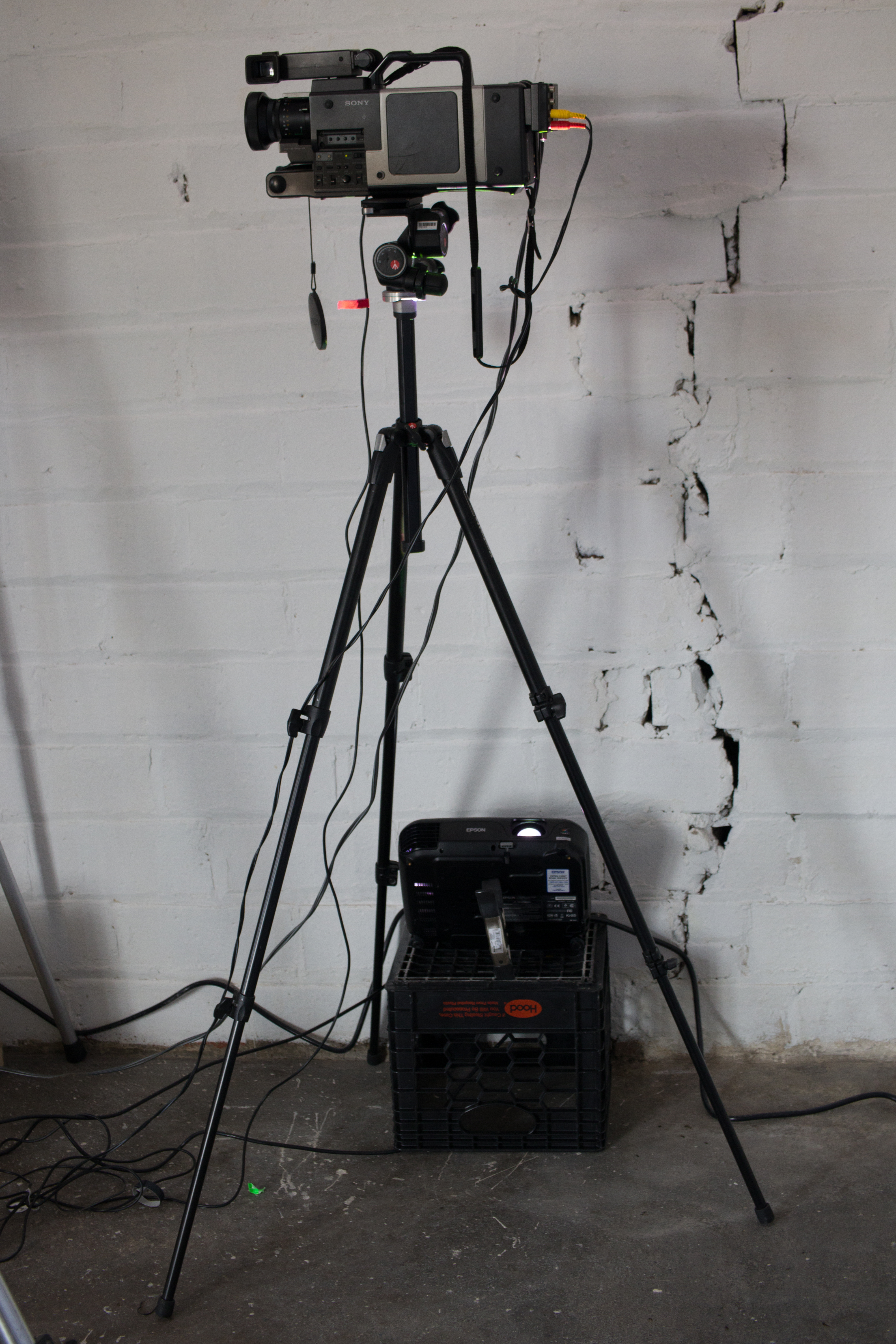 A live camcorder display was wired to a short throw projector. The result is a feedback loop where interactors who stand in front of the camcorder see their backside but cast no shadow. Viewers are the opposite of the screen can see people facing away and toward the camcorder unseen, except when they step forward and cast shadow from the projected light. The set up harkens to the closed participation of early television programming. Both physical bodies and shadows create afterimages resulting in two kinds of feedback and interaction across two rooms.